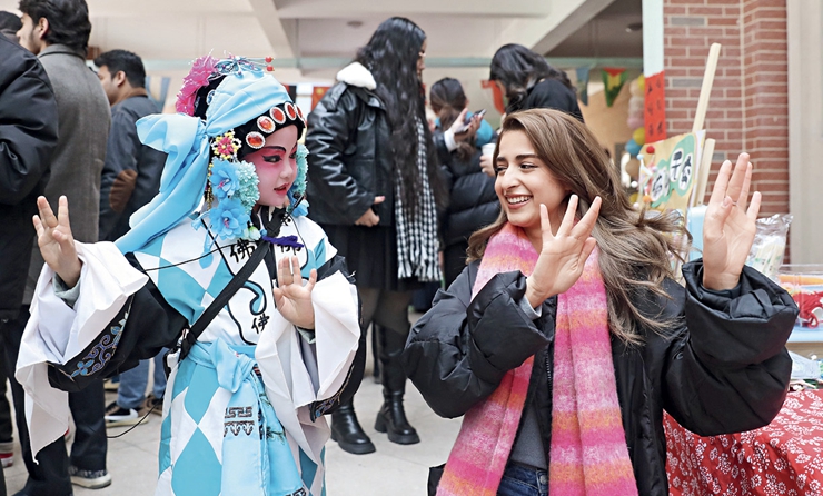About fifty foreign students participate in a large intangible cultural heritage market and discover traditional Chinese culture in Qingdao (Shandong), December 12, 2024.
