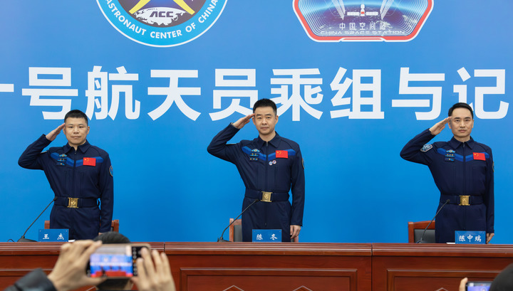 The three astronauts Chen Dong (center), Chen Zhongrui (right) and Wang Jie of China’s Shenzhou-20 mission during a press conference in Beijing, capital of China, January 16, 2026. (Photo: Li Minggang)